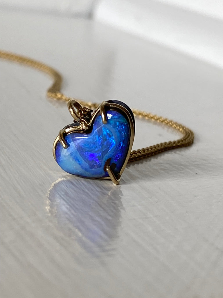This gorgeous Australian boulder opal in swirls of blue, is set into a feminine pendant with handmade silver and 18ct gold setting. Claws and a gold frame secure the opal, which is suspended from a n 18ct yellow gold Italian made chain.